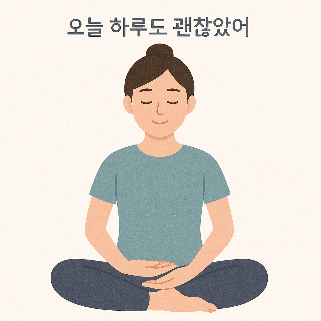 | 점심 2분 | ② 복식호흡 | 배꼽 아래 단전이 천천히 부푸는 걸 느끼기 | 안정감 회복 |