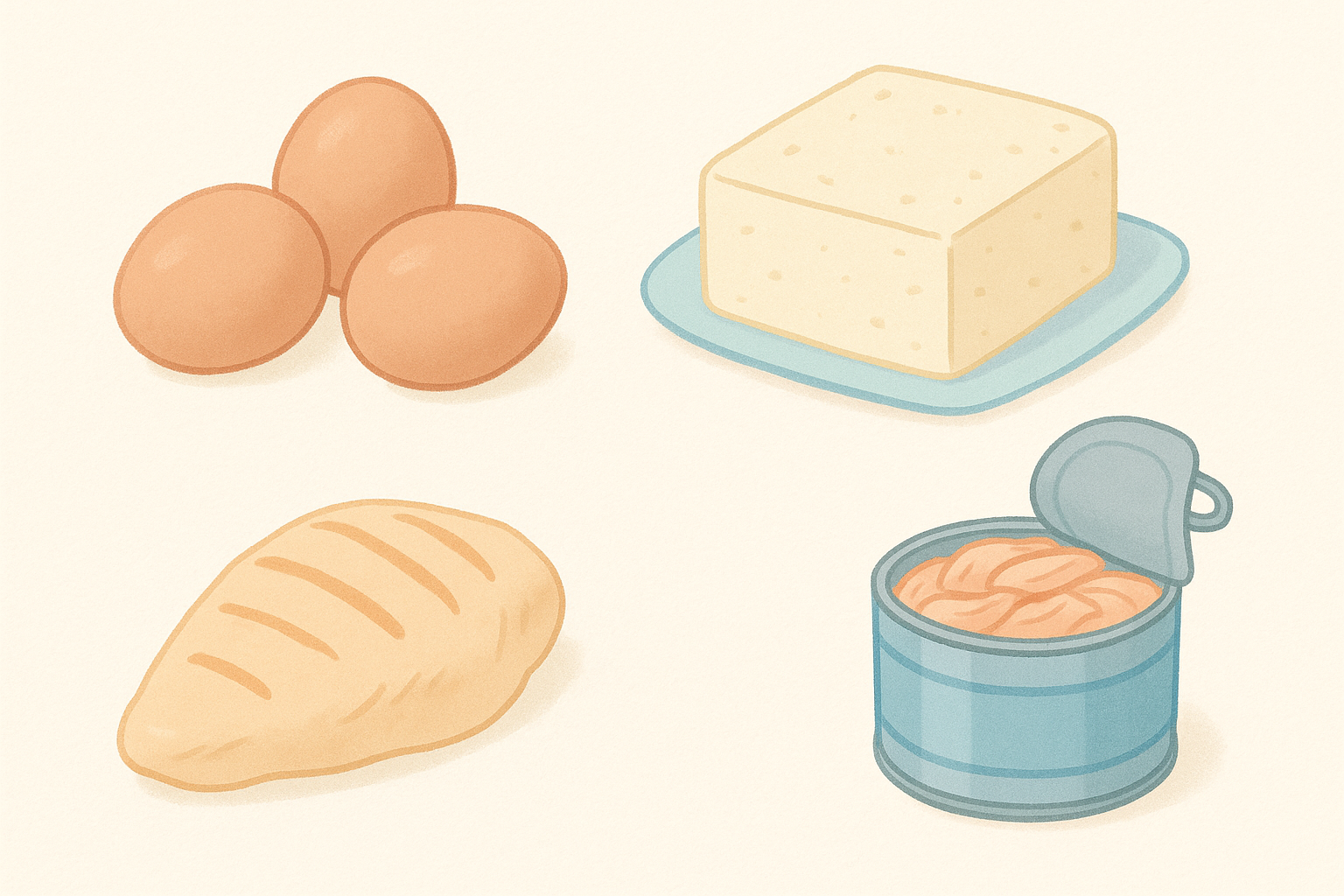 | 단백질 | 계란, 두부, 닭가슴살, 통조림 참치 | 포만감 유지 + 기초체력 유지 |