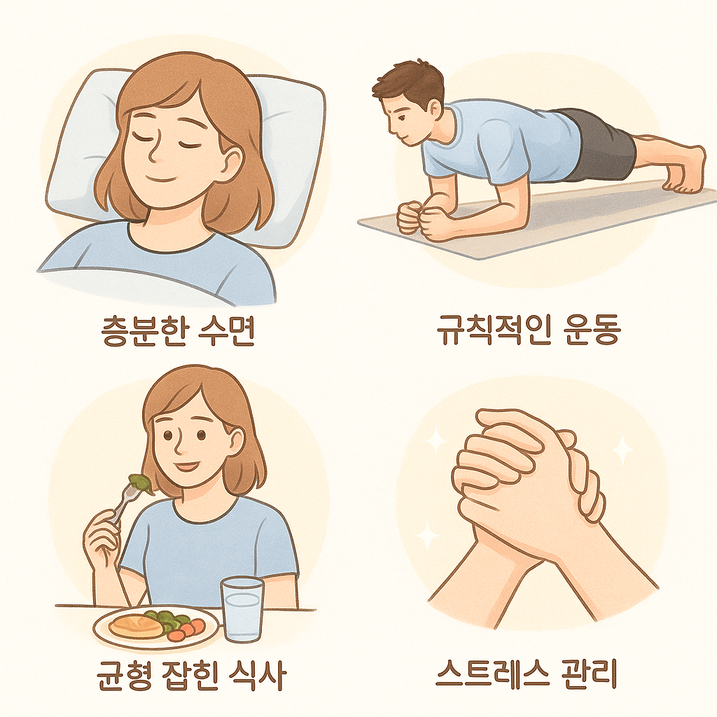 만성 스트레스는 자가면역 반응을 악화시키므로 수면 패턴과 휴식이 중요합니다.